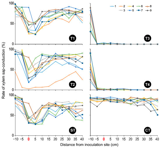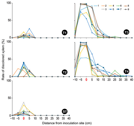 In contrast, all T3 and T4 xylems were unstained throughout the region from 5 cm below to 40 cm above the inoculation site (Figure S3), thus showing almost 0% of the sap-conduction area (Figure 4). In addition, the upper segments appeared drier. Both xylem discoloration areas were centered between 5 cm above and below the inoculation site but extended widely (−10 cm to 30 cm and −10 cm to 40 cm of the distance in T3 and T4, respectively) (Figure S3 and Figure 5). Treatments T3 and T4 clearly discolored the saplings more intensely than the T1 and T2 treatments (Figure S3 and Figure 5). As evidence of this, the maximum rate of xylem discoloration in each sapling was 54.43–99.83% in T4 and 73.68–99.03% in T3 (Figure 5).