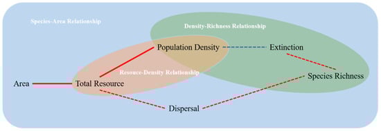According to the resource hypothesis of population ecology, population density rises as resource abundance rises, explaining the positive relationship between population density and habitat area [12,13,14]. According to Connor and McCoy (2013), an increase in resource abundance has the potential to shape the SAR by increasing population density of each species, and thus decreasing extinction rates [11]. To properly shape the SAR, this hypothesis needs one requirement and two sets of relationships. A greater habitat area with more resources is a requirement. In addition, there are two sets of relationships, including the resource–density relationship, in which more resources result in an increase in the population density of each species and the density–richness relationship, in which a rise in population density results in a decline in stochastic extinction rates, leading to the emergence of more species (Figure 1).