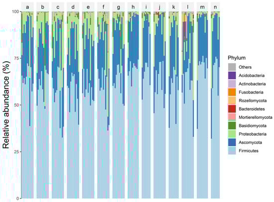 Histogram of dominant phylum stacking. A–n are the treatment group numbers and the top 10 phyla in terms of relative abundance of fungi and bacteria are shown. a–n is the id of each experimental group of Figure 2.