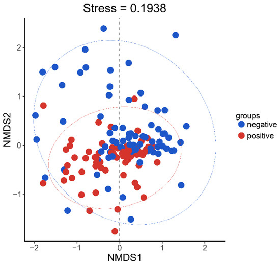Firmicutes, Proteobacteria, Bacteroidetes, Fusobacteria, and Actinobacteria were the prominent bacterial phyla that co-occurred in the samples, while Ascomycota, Basidiomycota, Mortierellomycota, and Rozellomycota were the dominant fungal phyla that co-occurred in the samples (Figure 3). The NMDS analysis revealed that, while the communities in the two treatment groups separated, the overlap was greater (Figure 4, stress = 0.1641); the differences within the negative group were larger. Samples from the negative group contributed significantly to the differences between the two treatment groups.