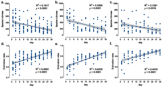 Linear relationships between microbial species richness and extinction rates in the microcosm system and time. (a–c) are linear relationships between species richness and microcosm establishment time for the overall positive and negative groups, respectively; (d–f) are the linear relationships between extinction rates and microcosm establishment time for the overall positive and negative groups, respectively. The solid line in the figure shows the linear regression model and the grey shading is the 95% confidence interval.