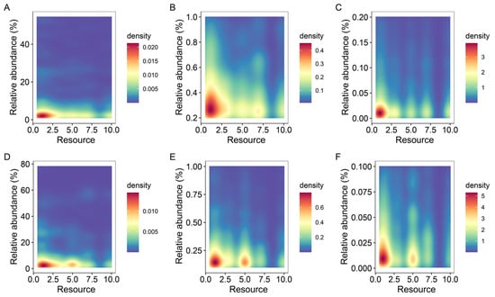Kernel density diagram of the relationship between resources and relative abundance of microorganisms (fungi and bacteria). In this figure, (A–C) are positive groups and (D–F) are negative groups; (A,D) are microbial taxa with relative abundance greater than 1%, (B,E) are microbial taxa with relative abundance between 0.1% and 1%, and (C,F) are microbial taxa with relative abundance less than 0.1%. Density is the kernel density of the number of species with corresponding relative abundance at a locus in the figure.