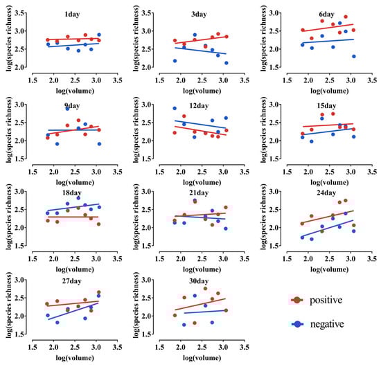 In both the overall positive and negative groups, species richness in the microcosm system decreased considerably as the microcosm establishment time grew, and extinction rates increased drastically as the microcosm establishment time increased (Figure 5).