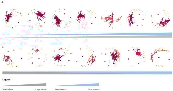 Microbial interactions network. (A) is the positive group, (B) is the negative group; grey triangular areas represent microcosm volume changes and blue triangular areas represent resource volume changes.