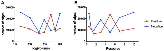 Plot of the number of microbial interactions network edges versus microcosm volume and resources. (A) shows the number of interactions network edges versus microcosm volume; (B) shows the number of interactions network edges versus resources.