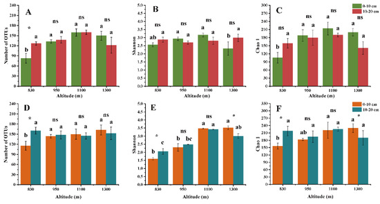 Observed number of OTUs, Shannon and Chao 1 indices of EcM (A–C) and SAP (D–F) fungal communities along the altitudinal gradient. (A,D) Observed number of OTUs; (B,E) Shannon index; (C,F) Chao 1 index. Different lowercase letters represent significant differences according to Tukey’s HSD test at different altitudes in the same soil layer (p < 0.05). Symbols indicate significant differences according to the Student’s T test between different soil layers at the same altitude. ns, not significant; *, p < 0.05.