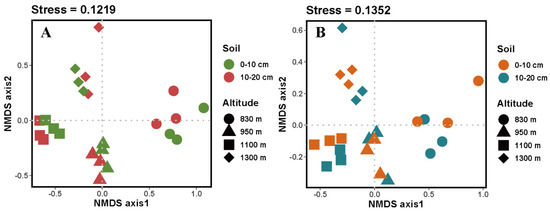 Nonmetric multidimensional scaling ordinations showing EcM (A) and SAP (B) fungal communities using the Bray–Curtis dissimilarity distance based on OTUs. Numbers after “Altitude” and “Soil depth” are R2, indicating the variation in EcM and SAP fungal community composition that can be explained by altitude or soil depth, detected using PERMANOVA.