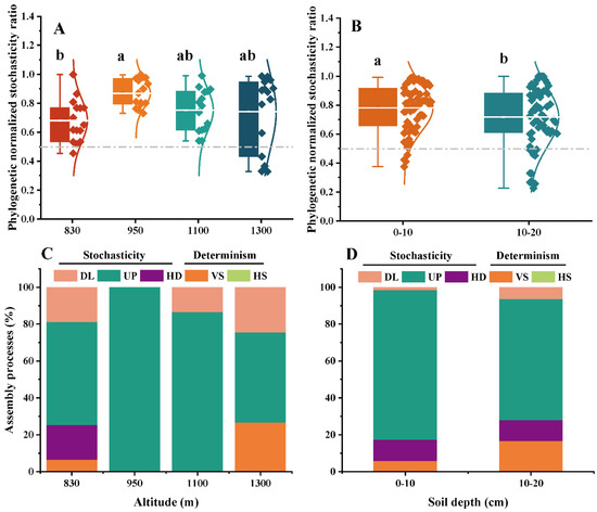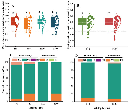 The ecological stochasticity in the potential SAP fungal community assembly is estimated by the phylogenetic normalized stochasticity ratio (pNST). (A) Ecological stochasticity among different altitudes; (B) ecological stochasticity between different soil layers. The values < 0.5 and >0.5 represent the deterministic and stochastic assembly, respectively. The relative contributions (%) of the community assembly processes in shaping SAP fungal communities at different altitudes (C) and soil layers (D). Different lowercase letters denote significant differences at different altitudes (or different soil layers) (p < 0.05). Differences between 0–10 cm and 10–20 cm soil layers were examined using a Student’s T-test. Differences among different altitudes were examined using Tukey’s HSD test. HS, homogeneous selection; VS, variable selection; HD, homogenizing dispersal; UP, undominated process; DL, dispersal limitation.