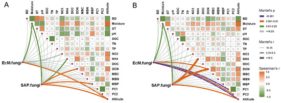 Abiotic and biotic drivers of the EcM and SAP fungal community compositions. (A) 0–10 cm soil layer; (B) 10–20 cm soil layer. EcM and SAP fungal community compositions (Bray–Curtis distance) were correlated with each environmental or biotic factor by partial Mantel tests. Pairwise comparisons of environmental and biotic factors are shown in the upper-right area, which is represented with a color gradient using Spearman’s correlation coefficients. The edge width represents the partial Mantel’s r statistic for the corresponding correlation, and the edge color indicates that significance is tested following 999 permutations. BD, bulk density; ST, soil temperature; SOC, soil organic carbon; TN, total nitrogen; TP, total phosphorus; NO3, nitrate nitrogen; NH4, ammonium nitrogen; DOC, dissolved organic carbon; DON, dissolved organic nitrogen; MBC, microbial biomass carbon; MBN. microbial biomass nitrogen; MBP, microbial biomass phosphorus; PC1 and PC2, the first and second axis scores of plant community composition.