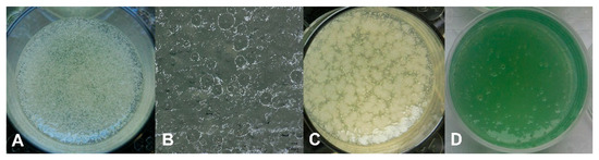 For the establishment of the 3D biofilm model, different percentages of agar and gelatin were dissolved in nutrient-rich medium to produce a haptic that resembles chronic wounds and that is easy to handle in the laboratory. A mixture of 1.5% agar and 1% gelatin was found to be optimal. For the incorporation of cavities to produce bacterial clusters in the model that resemble the appearance of microbes in chronic wounds [8], air bubbles were produced in the 3D models by vigorous shaking of the liquid agar/gelatin mixture with stainless steel balls just before the liquid was poured into 12-well plates. In Figure 1, the distribution of the air bubbles in the solidified 3D model is shown in top view (A) and cross section (B). Using these optimized conditions, a multispecies 3D biofilm model was produced by addition of S. aureus, E. coli, and A. baumannii. After maturation for 48 h, clusters of biofilm are visible in the top view (Figure 1C). The incorporation of P. aeruginosa into the 3D biofilm model resulted in a green appearance of the model after 48 h maturation (Figure 1D).