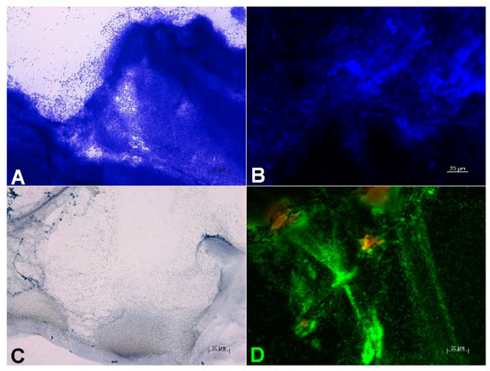 In Figure 3, microscopic images of the mature 3D biofilm model with P. aeruginosa are shown. Crystal violet staining (Figure 3A) for the visualization of bacterial cell walls and DAPI staining (Figure 3B) for the detection of bacterial DNA display a very dense bacterial growth in the mature biofilms. Gram staining of the 3D biofilm model with P. aeruginosa confirms the clustered growth of rod-shaped bacteria (Figure 3C). Staining with TOTO-1/SYTO 60 of the 3D biofilm model with P. aeruginosa shows a very active center of clustered biofilm growth (Figure 3D). Additionally, long strands of external DNA are visible, which are part of the extracellular matrix of the mature biofilm.