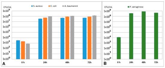 Stability testing of the multispecies 3D biofilm model (A) with S. aureus, E. coli, and A. baumannii, and the P. aeruginosa 3D biofilm model (B). After 24 h, a stable microbial population is established in both models, which remains stable until 72 h. The ratio of the bacteria to each other in the multispecies 3D biofilm model (A) remains the same during this period.