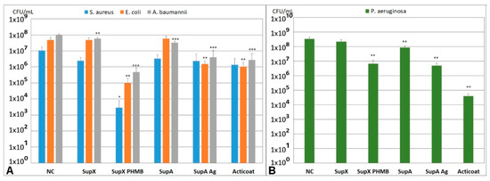 To demonstrate the suitability of the models for antimicrobial testing of wound dressings, the multispecies 3D biofilm model with S. aureus, E. coli, and A. baumannii and the 3D biofilm model with P. aeruginosa were incubated for 24 h with antimicrobial and non-antimicrobial wound dressings. The dressings were made from bacterial nanocellulose (SupX, SupX + PHMB) or alginate (SupA, SupA + Ag, Acticoat). The antimicrobial effects of polihexanide (SupX + PHMB) and silver (SupA + Ag, Acticoat) were compared (Figure 5A,B). In the multispecies 3D biofilm model, incubation with SupX + PHMB resulted in a significant reduction in all bacteria present in the model compared to the untreated control (Figure 5A). For S. aureus, a strong reduction in the bacterial count of more than 3 log levels was observed. This wound dressing was the only dressing with statistically significant antimicrobial effects on S. aureus in this study. Additionally, incubation with SupX + PHMB resulted in the strongest antimicrobial effects on E. coli and A. baumannii compared to the other tested antimicrobial wound dressings with silver. Incubation with the nanocellulose dressing without antimicrobial additives (SupX) resulted in no or little effects on the microbial count compared to the untreated control. Incubation of the multispecies 3D biofilm model with wound dressings containing silver ions and nanocrystalline silver reduced the bacterial count of E. coli and A. baumannii significantly compared to the untreated control. No differences in antimicrobial effect were observed between the two tested dressings SupA + Ag and Acticoat. For S. aureus, no significant reduction in the bacterial count was observed after incubation with silver containing wound dressings (Figure 5A). The alginate dressing without antimicrobial additives (SupA) showed no or little effect on bacterial counts in the multispecies 3D biofilm model compared to the untreated control. In the 3D P. aeruginosa biofilm model, incubation with the antimicrobial wound dressings SupX + PHMB, SupA + Ag, and Acticoat for 24 h resulted in a significant reduction in the bacterial count (Figure 5B). No differences in the antimicrobial effects were observed between SupX + PHMB and SupA + Ag. However, a significantly stronger antimicrobial effect was observed after incubation with Acticoat compared to SupA + Ag. No or little effect was apparent after incubation with the non-antimicrobial wound dressings SupX and SupA, with the effect of the alginate SupA on P. aeruginosa being comparable to the effect on A. baumannii in the multispecies model (Figure 5B).