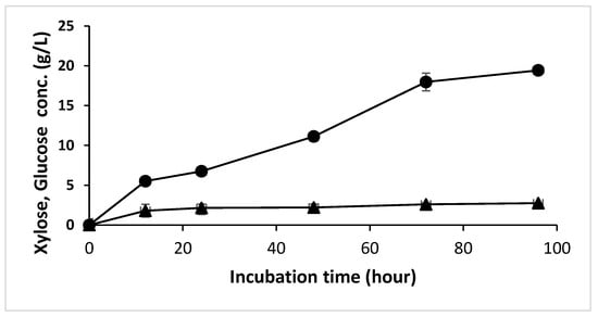 Xylose and glucose from OPEFB hydrolysis using xylanase. Xylose (solid circles), and glucose (solid triangles). Data presented are averages of triplicate experiments; error bars indicate the standard deviations.