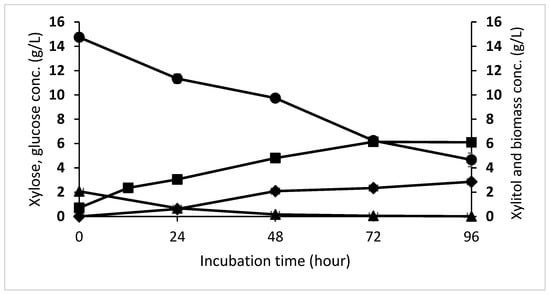 Moreover, in this xylitol fermentation, glucose consumption was observed. The presence of glucose, in an optimal amount as a co-substrate, resulted in the rapid accumulation of active biomass and increased availability of redox co-factors [NAD(P)H], which can improve the production parameters of xylitol fermentation [46]. Mardawati et al. [47] reported that the optimum glucose to xylitol ratio was 25%, while a ratio greater than that value resulted in low xylitol yield and xylose utilization. In this study, the glucose to xylose ratio in OPEFB hydrolysate was 14%, which means that this amount of glucose contributed to increasing biomass and xylitol production.