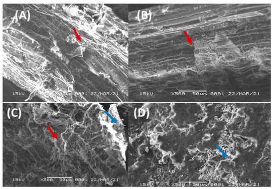 Scanning electron microscope images. Fresh OPEFB (A), after xylanase hydrolysis (B), after cellulase hydrolysis (C), after ethanol semi-SSF process (D). Lignin (red arrow), silica (blue arrow).