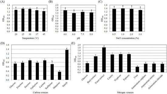 Effects of temperature, pH, NaCl concentrations, and different carbon and nitrogen sources on bacteria growth of strain BP-R2. Strain BP-R2 was cultured in Luria Broth (LB) medium (pH 7.5) at 20 °C, 25 °C, 30 °C, 37 °C, or 45 °C for 48 h to determine bacterial growth (OD600) (A). Strain BP-R2 was grown in LB medium with a pH of 4.0, 6.0, 7.5, or 9.0 at 30 °C (B); or in LB medium with 0.5%, 1.0%, 2.0%, or 3.0% sodium chloride (NaCl) at 30 °C (C) for 48 h to determine bacteria biomass (OD600). Strain BP-R2 was also cultivated in Agrobacterium minimal essential (AB-MES) medium with glucose, fructose, sucrose, galactose, lactose, raffinose, mannose, or starch at 30 °C (D); or in AB-MES media with 2% glucose and 0.5% beef extract, yeast extract, casein, tryptone, peptone, urea, ammonium sulphate, ammonium nitrate, or ammonium chloride at 30 °C (E) for 72 h to determine the bacterial biomass (OD600). Data are presented as the mean ± standard error (SE) from at least three independent bacterial growth experiments. Data were analyzed by Duncan tests and means with different letters were significantly different (p < 0.05).