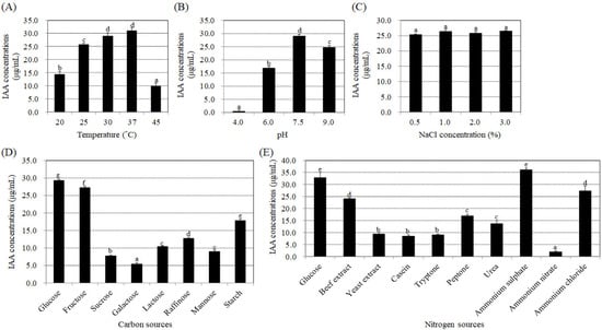 Furthermore, different carbon and nitrogen sources were used in the AB-MES medium to determine their effects on IAA production. Strain BP-R2 grew best with starch as the carbon source in the minimal medium at 30 °C for 72 h (Figure 1D), whereas the bacteria grew similarly with glucose, fructose, galactose, raffinose, sucrose, and lactose as the carbon sources (Figure 1D). The bacteria showed the least growth when cultured with mannose (Figure 1D). However, the strain produced the highest IAA amounts when grown with glucose and fructose, followed by starch and raffinose, and had the lowest IAA production when grown with galactose (Figure 2D). The results shown in Figure 1E indicated that strain BP-R2 grew best with yeast extract as the nitrogen source, followed by beef extract, casein, tryptone, and peptone. The strain showed even lower growth with ammonium sulphate, ammonium nitrate, and ammonium chloride as nitrogen sources, and grew the least with urea as the nitrogen source (Figure 1E). Surprisingly, strain BP-R2 had the highest IAA production when cultured with ammonium sulphate, followed by beef extract, ammonium chloride, urea, and peptone, and had the lowest IAA production when cultured with ammonium nitrate (Figure 2E). These data demonstrate that different carbon and nitrogen sources significantly affected IAA production when strain BP-R2 grew in the minimal medium. Furthermore, these data suggest that the bacteria growth mass might not directly correlate with IAA production levels.
