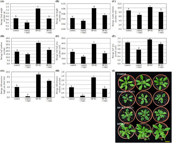 Inoculation of Arabidopsis with strain BP-R2 promoted its growth in comparison to the mock-inoculated control plants under salt stress treatments. Strain BP-R2 was grown in Luria Broth (LB) medium at 30 °C and then was used to inoculate Arabidopsis plants. After inoculation, the plants were treated with 250 mM NaCl for 5 days to create salt stress treatments and were subsequently recovered for 3 days by re-watering with distilled water. After salt stress treatments, the average values of the fresh weight per plant (A), dry weight per plant (B), rosette diameter per plant (C), leaf numbers per plant (D), total leaf area per plant (E), leaf area per leaf (F), inflorescence length per plant (G), and inflorescence numbers per plant (H) of the control and the BP-R2-inoculated plants under salt stress and nonstress conditions were recorded. Data are presented as the mean ± standard error (SE) from at least three independent bacteria inoculation experiments. More than 20 individual plants were examined for each bacteria inoculation assay. Data were analyzed by Duncan tests and means with different letters were significantly different (p < 0.05). (I) shows the top-view photographs of the mock-inoculated control and the BP-R2-inoculated plants after salt stress treatments. Yellow bar = 3 cm.