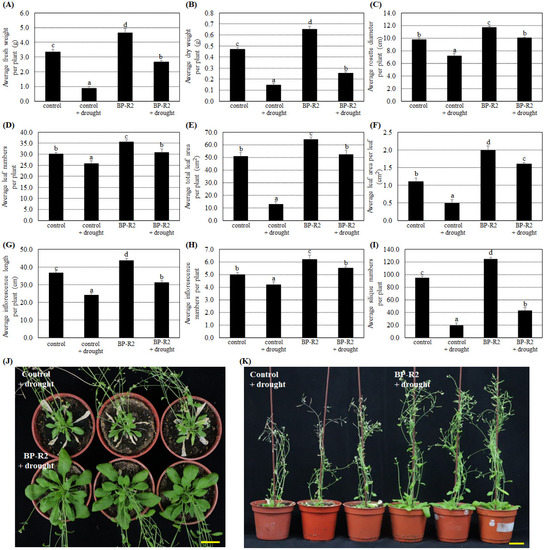 After strain BP-R2 inoculation, the Arabidopsis plants had better growth than the mock-inoculated control plants under drought stress treatments. Strain BP-R2 was cultured in Luria Broth (LB) medium and used to inoculate Arabidopsis plants. After bacteria inoculation, the plants were treated with drought stress for 10 days by withholding water and they were subsequently re-watered for 3 days for recovery. After drought stress treatments, the average values of the fresh weight per plant (A), dry weight per plant (B), rosette diameter per plant (C), leaf numbers per plant (D), total leaf area per plant (E), leaf area per leaf (F), inflorescence length per plant (G), inflorescence numbers per plant (H), and silique numbers per plant (I) of the control and the BP-R2-inoculated plants under drought stress and nonstress conditions were examined. Data are presented as the mean ± standard error (SE) from at least three independent bacteria inoculation experiments. More than 20 individual plants were examined for each bacteria inoculation assay. Data were analyzed by Duncan tests and means with different letters were significantly different (p < 0.05). (J) shows the top-view and Panel (K) shows the side-view photographs of the mock-inoculated control and the BP-R2-inoculated plants after drought stress treatments. Yellow bar = 3 cm.