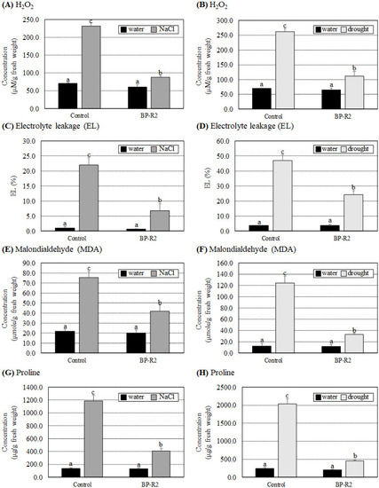 The BP-R2-inoculated pak choi (Brassica rapa) plants had lower induced H2O2, electrolyte leakage (EL), malondialdehyde (MDA), and proline concentrations than the mock-inoculated control plants under salt and drought stresses. The H2O2 concentrations (A,B), EL (C,D), MDA contents (E,F), and proline contents (G,H) were recorded in the mock-inoculated control and the BP-R2-inoculated plants under salt (A,C,E,G) and drought (B,D,F,H) stress treatments. Data are presented as the mean ± standard error (SE) from at least three independent bacteria inoculation experiments. More than 10 individual plants were examined for each bacteria inoculation assay. Data were analyzed by Duncan tests and means with different letters were significantly different (p < 0.05).