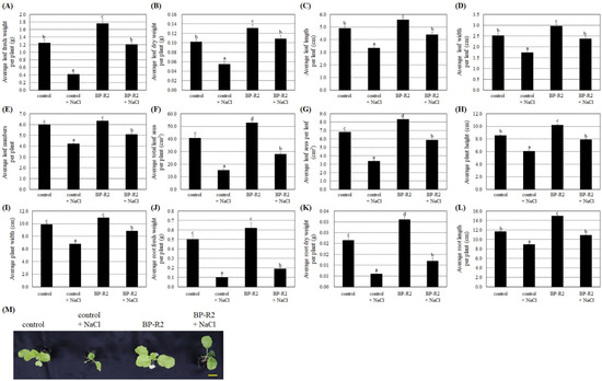 Strain BP-R2 enhanced various growth parameters of the pak choi (Brassica rapa) plants compared to those of the mock-inoculated control plants under salt stress. After pak choi plants were inoculated with bacteria strain BP-R2, the plants were treated with 200 mM NaCl for 5 days to create salt stress and were then recovered for 3 days by re-watering with distilled water. After salt stress treatments, the average values of the leaf fresh weight per plant (A) leaf dry weight per plant (B), leaf length per leaf (C), leaf width per leaf (D), leaf numbers per plant (E), total leaf area per plant (F), leaf area per leaf (G), plant height (H), plant width (I), root fresh weight per plant (J), root dry weight per plant (K), and root length per plant (L) of the mock-inoculated control and the BP-R2-inoculated plants under salt stress and nonstress conditions were documented. Data are presented as the mean ± standard error (SE) from at least three independent bacteria inoculation experiments. More than 20 individual plants were examined for each bacteria inoculation assay. Data were analyzed by Duncan tests and means with different letters were significantly different (p < 0.05). (M) shows the top-view photographs of the mock-inoculated control and the BP-R2-inoculated plants after salt stress treatments. Yellow bar = 3 cm.