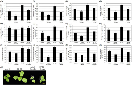 The pak choi (Brassica rapa) plants were larger and heavier after inoculation with strain BP-R2 under drought stress. After inoculation with strain BP-R2, plants were treated with drought stress for 5 days by withholding water and the plants were subsequently re-watered for 3 days for recovery. After drought stress treatments, the average values of the leaf fresh weight per plant (A), leaf dry weight per plant (B), leaf length per leaf (C), leaf width per leaf (D), leaf numbers per plant (E), total leaf area per plant (F), leaf area per leaf (G), plant height (H), plant width (I), root fresh weight per plant (J), root dry weight per plant (K), and root length per plant (L) of the mock-inoculated control and the BP-R2-inoculated plants under drought stress and nonstress conditions were determined. Data are presented as the mean ± standard error (SE) from at least three independent bacteria inoculation experiments. More than 20 individual plants were examined for each bacteria inoculation assay. Data were analyzed by Duncan tests and means with different letters were significantly different (p < 0.05). (M) shows the top-view photographs of the mock-inoculated control and the BP-R2-inoculated plants after drought stress treatments. Yellow bar = 3 cm.