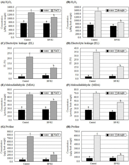 To further understand the possible mechanisms of growth improvement by strain BP-R2 in Arabidopsis plants under salt and drought stresses, we examined several biochemical parameters in the control and the BP-R2-inoculated Arabidopsis plants under stresses. The H2O2, EL, and MDA concentrations are major indicators of oxidative stress damage in plants under various stress conditions. The results of Figure 5A–F showed that there was no significant difference in H2O2, electrolyte leakage, and MDA concentrations in the control and the BP-R2-inoculated Arabidopsis plants under nonstress conditions (with water treatments). The H2O2 content increased 3.3-fold in the control plants after salt stress treatments, whereas it only increased 1.5-fold in the BP-R2-inoculated plants under the same stress treatments (Figure 5A). Similarly, under drought stress, the H2O2 concentrations showed a 3.7-fold increase in the control plants, whereas it showed only a 1.7-fold increase in the BP-R2-inoculated plants under drought stress (Figure 5B). Furthermore, the EL and MDA contents were significantly increased in the control plants under both NaCl and drought treatments, whereas the fold increases were less in the BP-R2-inoculated plants under the same stress treatments (Figure 5C–F). Plants can accumulate different metabolites, such as proline and other active molecules, to help them tolerate salt and drought stresses. The results shown in Figure 5G,H demonstrate that proline concentrations were induced more than 8.4-fold in the control plants under salt and drought stresses, while it was only induced by 2.2- to 3.0-fold in the BP-R2-inoculated plants under the same stresses. These data indicated that the BP-R2-inoculated plants showed better growth and experienced less oxidative stress damage compared to the control plants under salt and drought stresses.