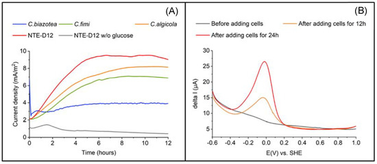 (A) Comparison of current production among four strains (C. biazotea, C. fimi, C. algicola, and strain NTE-D12) using carbon electrode as a working electrode. (B) Differential pulse voltammograms of strain NTE-D12 before and after adding cells for 12 and 24 h using ITO electrode as a working electrode.