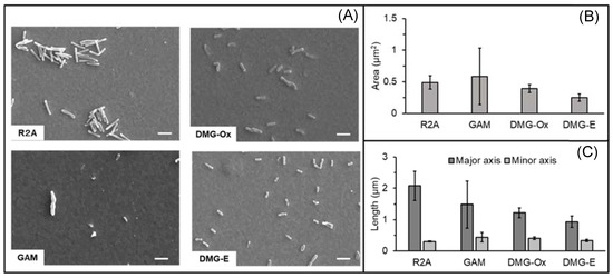 (A) Cells observed using scanning electron microscopy (SEM). Scale bar = 1.0 µm. (B) Comparison of the observed area and (C) major axis and minor axis of cells after aerobic culture in R2A (R2A, n = 12), anaerobic culture in GAM (GAM, n = 15), aerobic culture in DMG (DMG; DMG-Ox, n = 10), and electrochemical culture in DMG (DMG-E, n = 18). Error bars represent standard deviation.