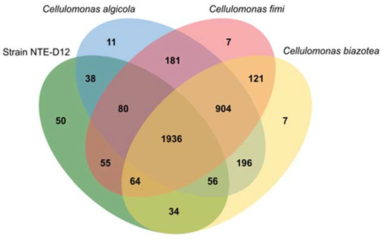 Venn diagram showing orthologues gene clusters among four strains (Cellulomonas biazotea, Cellulomonas fimi, Cellulomonas algicola, and Cellulomonas sp. strain NTE-D12).