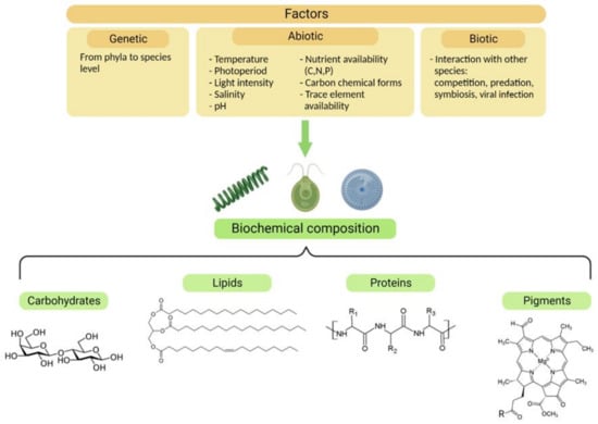 Akin to nutrient starvation or limitation, many other abiotic factors contribute to the biochemistry of microalgae (Figure 2). Additionally, biotic factors such as competition for resources, predation, and symbiosis can drastically affect the behavior and composition of microalgae [,,]. The presence of predators affects algal palatability, modulating their organic composition, and activating their chemical defenses [].