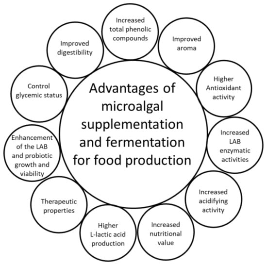 In the search for new or alternative crops to meet the growing demand for food (and feed), algae represent an emerging biological resource for sustainable innovative transformation [,]. Indeed, with respect to environmentally friendly food production, algae can be produced on non-arable land, allowing for a high rate of production per square meter compared to plants; intensive alga cultivation systems require only a minimal use of freshwater, and can even use seawater []. Food-processing wastewater also has the potential to be valorized as an algal growth medium once its biomass safety has been assessed [].