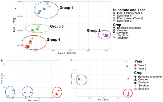 Principal coordinate analysis (PCoA) for the fungal communities from plant tissue and soils of sorghum and legumes over two years. All substrates (a), plant tissues (b), and soil (c).
