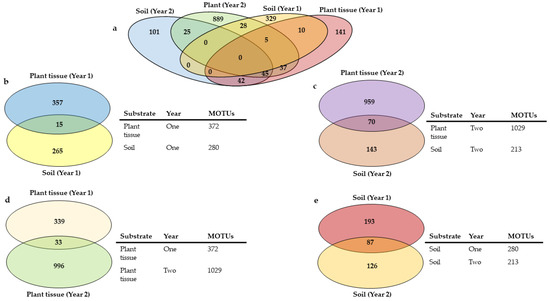 Plant and soil samples grouped separately in PCoA analyses (Figure 1a), with the soils showing much more variation between the years, while the plants were more stable with overlaps between the years. The plant and soil cores were statistically significant (p = 0.001), despite sharing a common core (Table 3; Figure 3a–c). Plants were more diverse than soils in both years, with the diversity of soil more or less the same and in plants increasing by three times in the second year (Figure 3b,c). The overlap between plants and soils increased more than four times in year two. Within substrates, variations were also observed between the years, but more within the plant tissues (Figure 3d) than the soils, which were relatively the same (Figure 3e). The degree of overlap between years for plants and soils was less than the number of unique MOTUs.