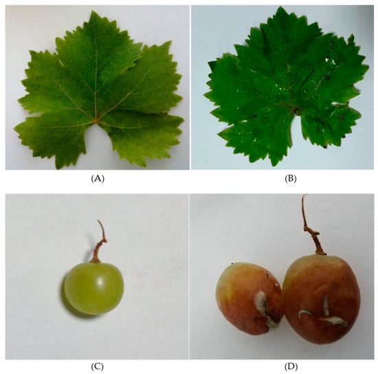 Confirmation of Ps. syringae pv. syringae and B. cinerea infection on leaves and fruits of V. vinifera. (A) Control grape leaves; (B) Ps. Syringae pv. Syringae-infected leaves; (C) control grapes; (D) B. cinerea infection on grapes.