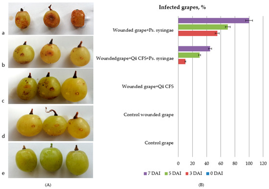 In vivo antimicrobial activity of Lp. plantarum Q4 against Ps. syringae in grapes. (A) In vivo infection of grapes with Ps. syringae on the seventh DAI: (a) 100% wounded grapes + Ps. syringae; (b) 45% wounded grapes + CFS from Lp. plantarum Q4 + Ps. syringae; (c) wounded grapes + CFS from Lp. plantarum Q4; (d) control wounded grapes; (e) control grapes. (B). In vivo antifungal effect of CFS from Lp. plantarum Q4, expressed as percent of infected grapes.