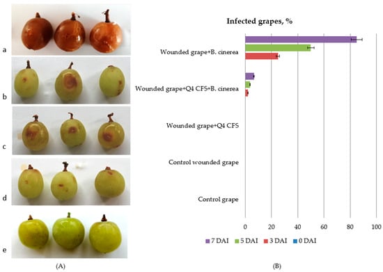 Figure 6 shows the antifungal effect of the CFS from Lp. plantarum Q4 against B. cinerea compared to the treatment with the control wounded grapes treated with MRS only (Figure 6d,e), wounded grapes treated with the Lp. plantarum Q4 fermented CFS (Figure 6c), wounded grapes treated with both the Lp. plantarum Q4 CFS and B. cinerea spores (Figure 6b), and wounded grapes infected with B. cinerea spores (Figure 6a). Results were examined on the seventh DAI. At this time, a decrease in the number of contaminated grapes was achieved in the Lp. plantarum Q4 CFS- and B. cinerea spore-treated fruits—from 85% to 10% less contaminated grapes compared to B. cinerea spore-treated fruits (Figure 6B). Our results are similar to those reported by Dupozo et al. (2022) and Marín et al. (2019) [86,87].