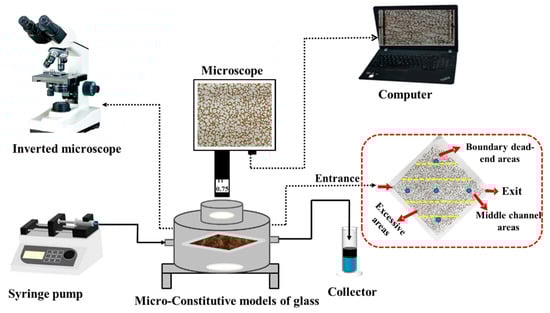 The schematic diagram of the displacement experimental equipment process is illustrated in Figure 1. The oil–water area, distribution, and morphology of residual oil mobilization under the different displacement fluid conditions were investigated by the visual micromodel experiments, and the oil recovery was calculated (Equation (1)). This system consisted of an inverted microscope for observing the distribution of residual oil in the micromodel before and after different fluids’ displacement. A syringe pump was used to inject fluids at low rates. A camera was placed above the micromodel for capturing images at defined time intervals. During the whole process of displacement, the experimental temperature was controlled at 45 °C. The experimental design is shown in Table 1.
