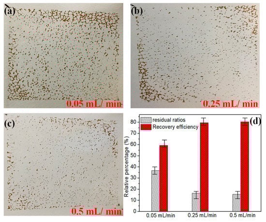 To simulate the distribution characteristics of residual oil migration in low-permeability reservoirs, the distribution and residual ratios of residual oil under different water flooding rates (0.05, 0.25, and 0.5 mL/min) were investigated and analyzed (Figure 2a–c), and the corresponding oil recovery was calculated, respectively (Figure 2d). When the water flooding rates were 0.05, 0.25, and 0.5 mL/min, the residual ratios of crude oil were 36.8%, 18.4%, and 14.5%, and the average recovery efficiencies were 68.8%, 83.5%, and 84.5%, respectively. These results implied that the crude oil recovery efficiency increased with the increase in injection rates, but the increasing trend slowed down when it reached a certain injection rate. The primary water flooding can only sweep the crude oil in the middle channel and the excessive region due to the physical properties of the fluid, and the boundary blind end crude oil cannot be driven out. In general, about 50–60% of the residual crude oil in the reservoir after water flooding []. Thus, 0.05 mL/min was selected as the oil-displacement rate to carry out the micromodels in the subsequent experiments, because the residual oil distribution at this time was closer to the actual residual oil ratio of the reservoir after water flooding.