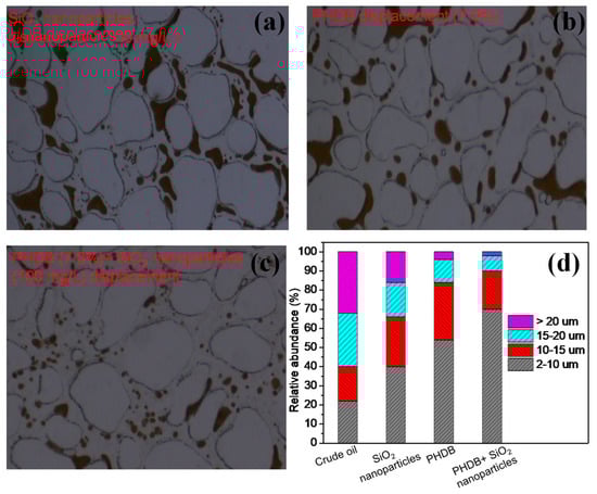 One of the most commonly used methods for evaluating the dispersion stability of the emulsion is by microscopic observation of the droplet size distribution of crude oil. According to the basic theory of emulsion [], the smaller the droplet size and the more uniform its distribution, the more stable the emulsion. Therefore, to further prove the emulsification and dispersion ability of the PHDB-SiO2 nanoparticle composite displacement on the residual oil, the effects of different displacement fluids on the droplet size of residual crude oil were investigated (Figure 3d). Crude oil was not well emulsified before displacement but dispersed as big droplets in the production water. The droplet size distribution shows that most of the oil droplet sizes were larger than 15 μm (counted to 61%). After different displacement fluid actions, most of the residual oil droplets had sizes between 2 and 15 μm. The residual oil droplets with sizes of 2–15 μm averaged 64% in the SiO2 nanoparticle displacement, which increased to 84% in the PHDB displacement and then gradually increased to 90% in the PHDB-SiO2 nanoparticle composite displacement. These results indicated that the PHDB-SiO2 nanoparticle composite displacement formed a synergistic effect favoring an enhanced emulsion of the crude oil. The emulsification of residual oil greatly improved the dispersion of oil. Therefore, the finely dispersed crude oil droplets were able to be displaced from the pores of the oil reservoir so that oil recovery was enhanced. Additionally, considering the abundance of PHDB in the real reservoir environment, the industrial PHDB-SiO2 nanoparticle composite displacement fluid is mainly microbial nutrient activators and SiO2 nanomaterials. The nutrient activates PHDB in situ in the reservoir while coupling with the SiO2 nanoparticles to emulsify and displace the residual crude oil, and to EOR.