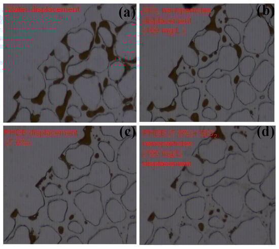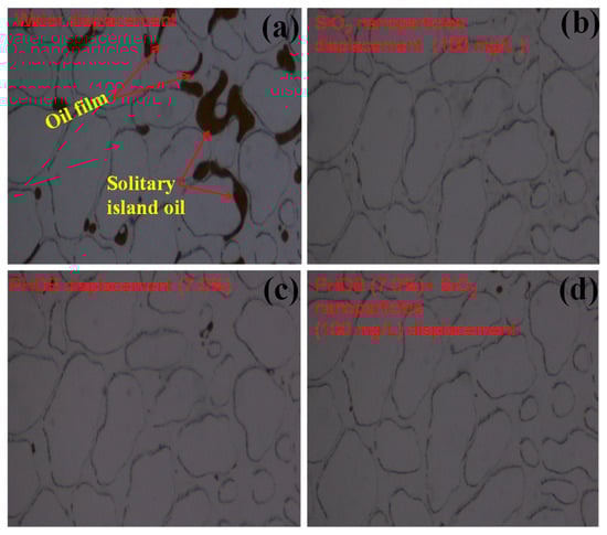 After water flooding, a small amount of the residual oil existed in the middle channel areas in the form of the states of the droplets and clusters (Figure 4a), which indicated that most of the residual oil in this area was displaced because of the effective sweep of water injection. Compared with water displacement, Figure 4b,c show that there is almost no remaining oil in the channel pore of the middle areas, indicating that the PHDB or SiO2 nanoparticles have a good displacement effect on the residual oil in the middle channel pore. In Figure 4d, the residual oil was almost completely displaced in middle channel areas after PHDB-SiO2 nanoparticles composite displacement because the PHDB itself and its metabolites could split the large oil droplets into smaller ones that could pass through the water flooding channels with the help of nanoparticles.