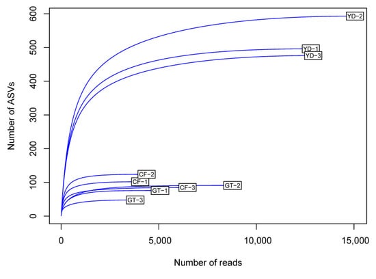 Rarefaction curves for the chironomid samples (GT and CF) and the filter samples (YD). GT: G. to-kunagai; CF: C. flaviplumus; YD: Yeon Deung water.