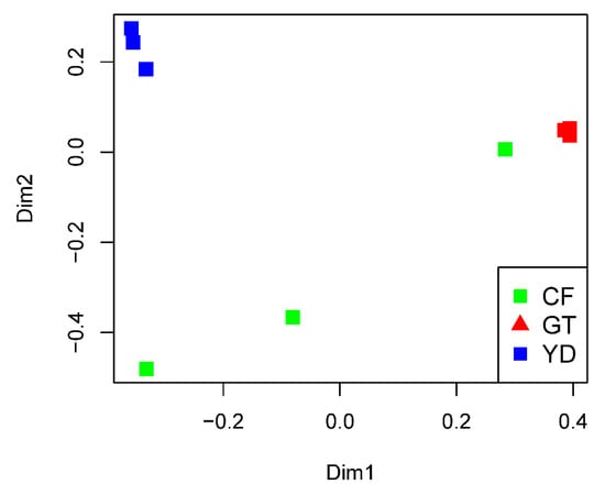 PCoA plot showing Bray–Curtis dissimilarities between the studied samples. GT: G. tokunagai; CF: C. flaviplumus; YD: Yeon Deung water.