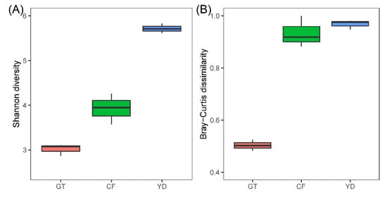 Shannon diversity (α-diversity) (A) and the within-group Bray–Curtis dissimilarity (β-diversity) (B) of the studied samples. GT (red): G. tokunagai; CF (green): C. flaviplumus; YD (blue): Yeon Deung water.
