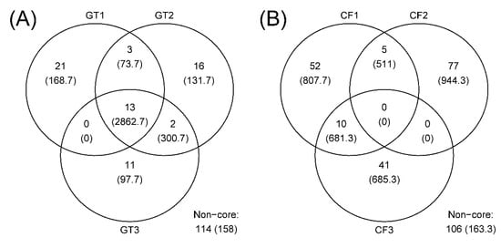 Venn diagrams showing the number of ASVs and their average abundance (the number of reads) in each chironomid species. (A) GT: G. tokunagai; (B) CF: C. flaviplumus.