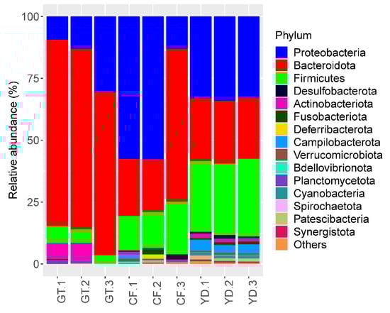 Relative abundance of the 10 most abundant phyla in the studied samples. GT: G. tokunagai; CF: C. flaviplumus; YD: Yeon Deung water.