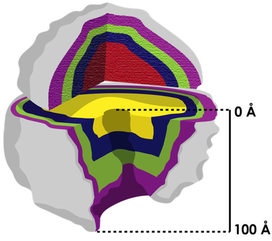 The ribosome is conceptualized as an onion (with layers indicated in different colors) that grows from the center (the most ancestral part). The two subunits evolved independently (most inner shell in different color) at first, and the process of coevolution occurred later when they associated. According to Williams [36], the only structure that evolved continuously on the ribosome was the exit tunnel (it extends over 100 Å from the PTC to the vestibule). Other authors [58] have demonstrated that differences in the exit tunnel increase among organisms from the center to the surface.