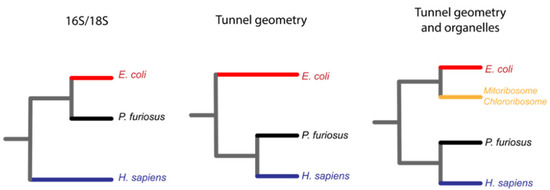 Another interesting publication that profits from the newly available structures of the ribosomes demonstrates that the classical tree of life can be reconstructed from the pure geometry (Figure 5) of the exit tunnel [58]. The authors derive a metric that describes the geometric features of the ribosomal exit tunnel of many species among the three kingdoms of life. With this approach, they managed to define radius variation plots that are clustered to differentiate and properly allocate the branches of the three domains of life.