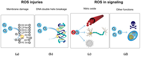 As alternatives to these adaptations between pathogens and hosts, there are several pathways that use ROS as key elements in eukaryote signaling. For instance, nitric oxide plays a central role in the regulation of many functions such as vascular tone, nerve function, and immune regulation (Figure 7c). Another example is demonstrated by diatomic oxygen, because this compound plays an important role in the intracellular signaling of tumor necrosis factor-α (Figure 7d) [79].